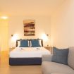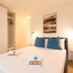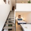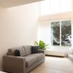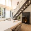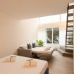 Descending the stairs, you arrive at the living/sleeping area, a well-organized and welcoming space. Under the mezzanine, the double bed creates an intimate and tranquil space for a rejuvenating rest. The living area is completed by a sofa bed, positioned in front of the double French doors leading to the garden. Natural light floods the room, creating a warm and relaxing atmosphere.