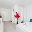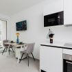 In this cozy studio, every detail has been designed to maximize comfort and functionality. The bright living area opens onto a furnished terrace with elegant outdoor seating and views of the Cassarate River, creating a natural extension of the living space. The kitchen, equipped with state-of-the-art appliances, includes an induction cooktop, multifunction oven, microwave, and compact dishwasher. The double bed, featuring an ergonomic mattress and premium linens, is cleverly integrated into the space with space-saving solutions. The dining area hosts an extendable table with designer chairs. The bathroom, finished with high-quality materials, boasts an XXL rain-effect shower with chromotherapy. Adjustable smart lighting, an advanced air conditioning system, and high-quality finishes complete this refined 35 sqm environment, where modernity and comfort blend in perfect harmony.